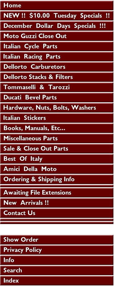 Miles, Moto Giro 2006 Miniature Bayonet Bulb, 12v 3w CEV/Veglia Miniature Bayonet Bulb, SMITHS 12v 3w Miscellaneous Links Miscellaneous Rubber Parts Miscellaneous Fuel & Intake Miscellaneous Parts Miscellaneous Parts Missalanious Parts MOCA "Big Wheel" art exibit Los Angeles, CA Moe & Joyce, Cycle Garden Huntington Beach CA. Mondial Racer, Reggio Morbidelli Work Shop, Pesaro Mostra Scambio Moto Giro 2006 Moto Guzzi Falcones Moto Guzzi Nuovo Falcone Custom Moto Guzzi Super Charged 250cc Moto Guzzi V8 Factory Race Bike Moto Guzzi 500cc Single Factory Race Bike Moto Guzzi 500cc V-Twin Factory Race Bike Moto Guzzi 75th Anniversary Sterling Silver Plaque Moto Guzzi Close Out Motobi Spring Lasting Motorcycle Racing Video Collection, 3 VCR Tapes Mr. Itom, Covina Ca. Mr. Moto Giro d' California Mr. & Mrs. Guido Mr. Free Two Wheel Mufflers For Every Bike Museo MV Agusta, Milano MV Vintage Grip Set W/Logo 100, 125, 150, 175cc Needle Clip PHF & PHM 30-40mm Needle Jets PHF PHM Carbs, 30-40mm New Arrivals !! New Parts 7/2014 New Parts Added 6/2011 New Parts Added 7/2008 New Parts Added 8/2009 New Parts Added 1/2008 New Parts Added 1/2009 New Parts Added 1/2018 New Parts Added 1/2021 New Parts Added 1/2023 New Parts Added 10/2008 New Parts Added 10/2010 New Parts Added 10/2015 New Parts Added 10/2018 New Parts Added 10/2019 New Parts Added 10/2022