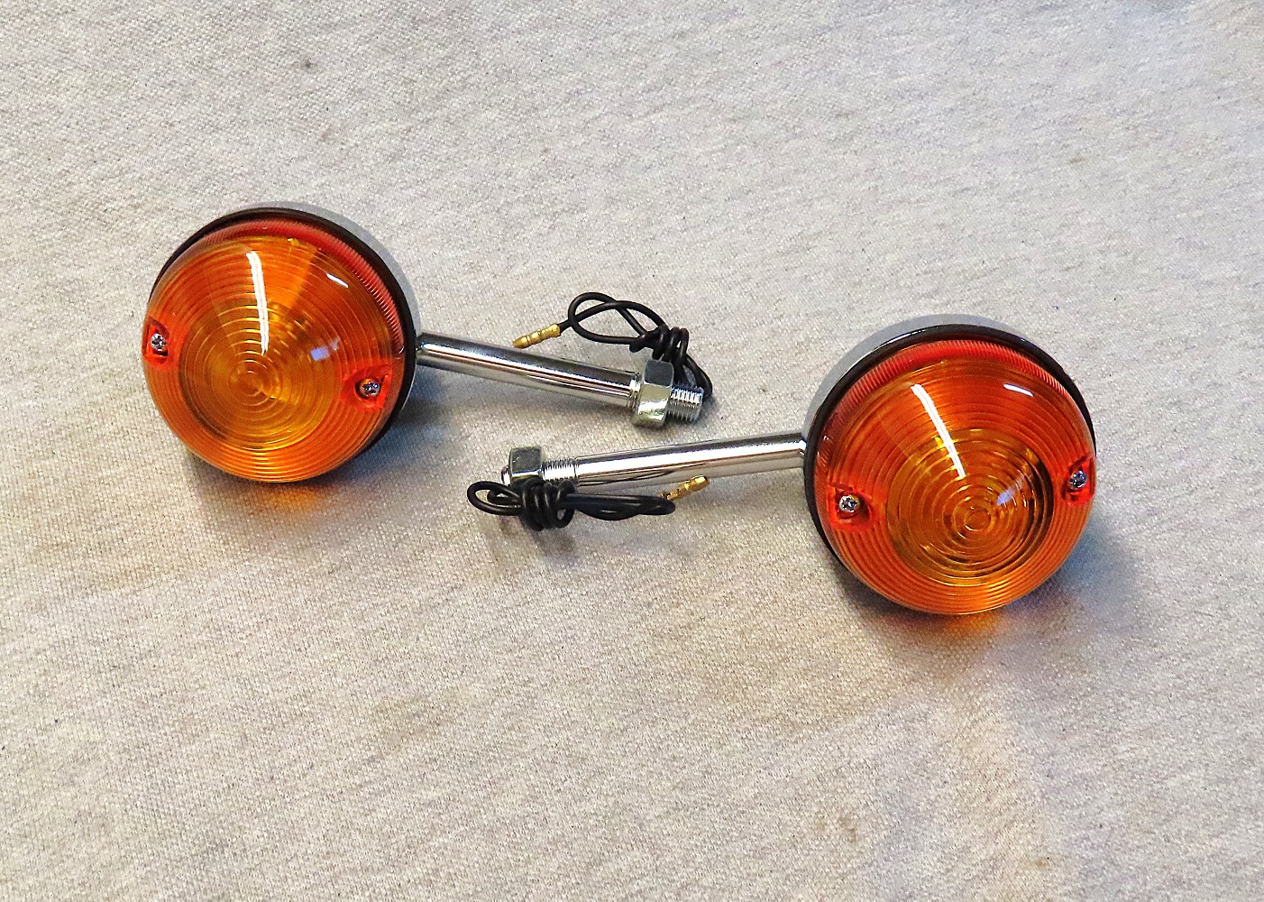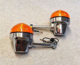 Lucas turn signal set for lots of 70's bikes made by EMGO. Comes in a set of two signals with 80mm chrome stocks.
