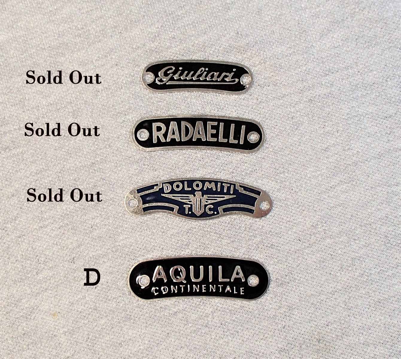 Italian seat badge made out of Aluminum complete with rivets. These badges were used on lots of Italian bikes of the 1950's and 60's. Please select the type of badge you want from the pull down menu.